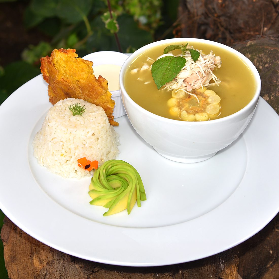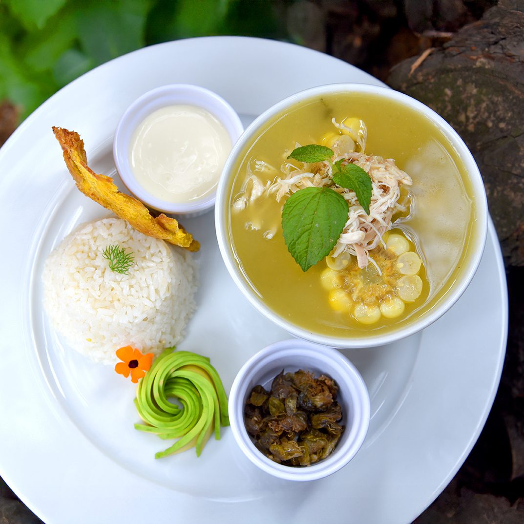 Caldo de pollo con papa criolla, mazorca, pollo desmechado, guascas y alcaparras, acompañado de aguacate y arroz blanco. Tradición colombiana en Restaurante 3 Soles Chía.