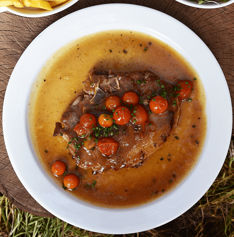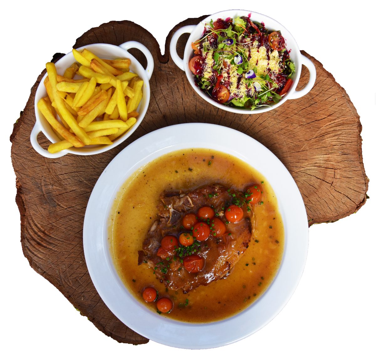 Chuleta de cerdo bañada en salsa de reducción de tamarindo con tomates cherry. Acompañada de papas a la francesa y arroz.