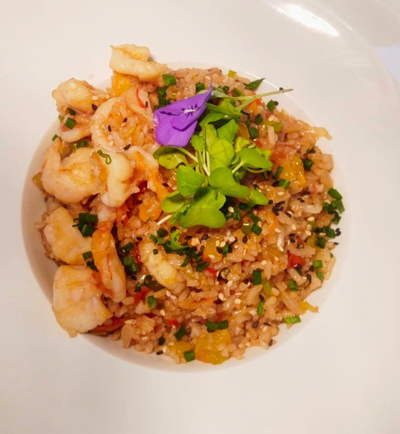 Arroz frito al estilo chino-peruano con vegetales, jengibre, soya y ajonjolí, preparado con camarón.