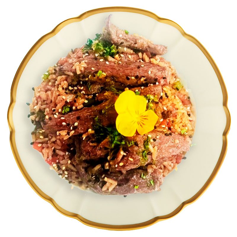 Arroz frito al estilo chino-peruano con vegetales, jengibre, soya y ajonjolí, preparado con carne y salsa de soja.