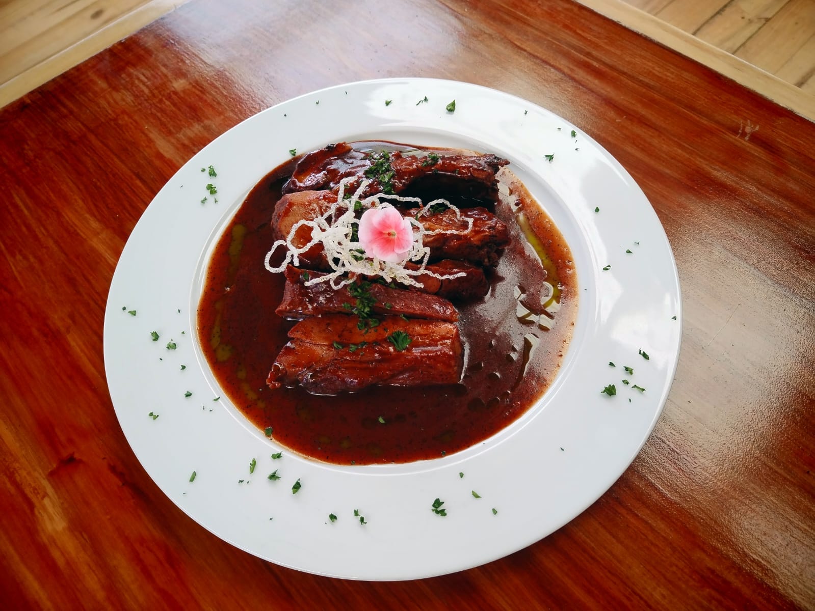 Costillitas de cerdo en salsa BBQ de tamarindo, acompañadas con papa a la francesa y guacamole.