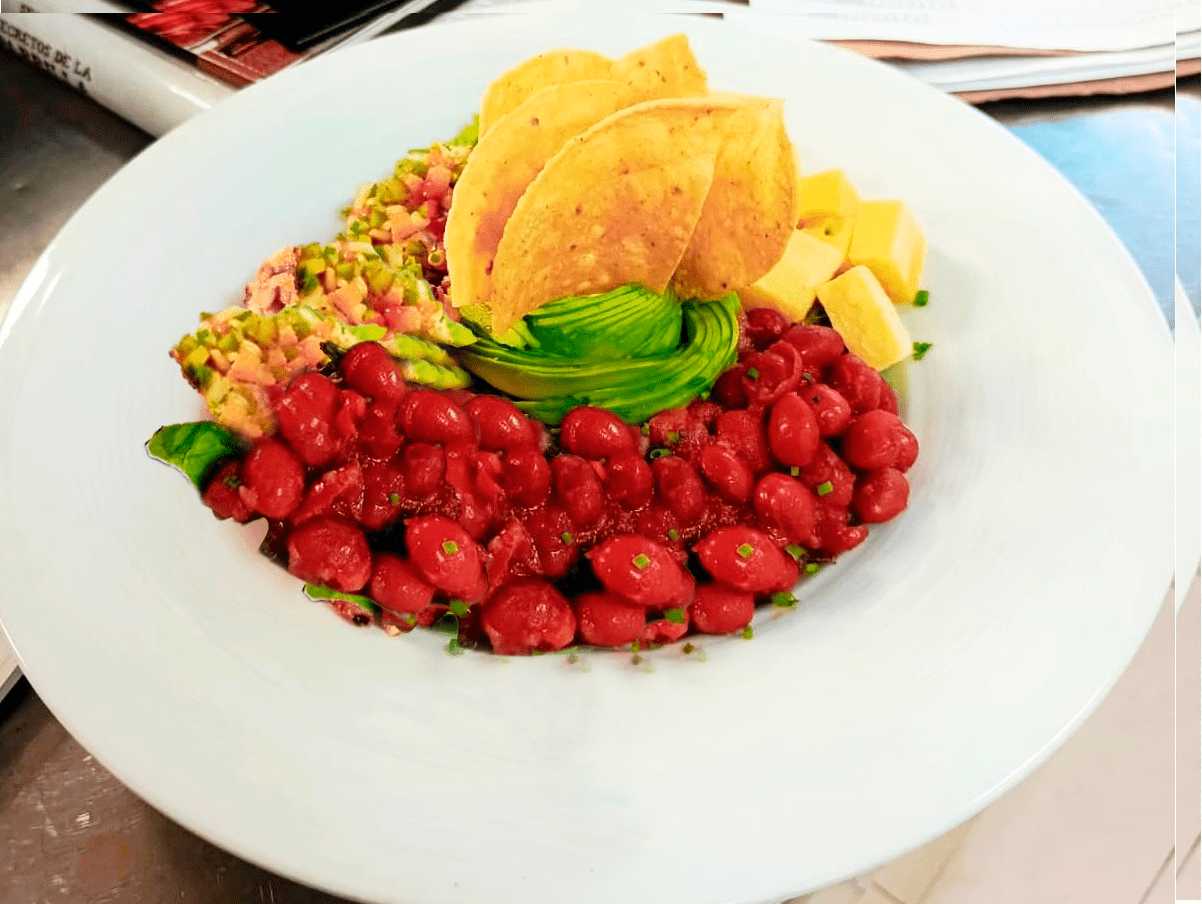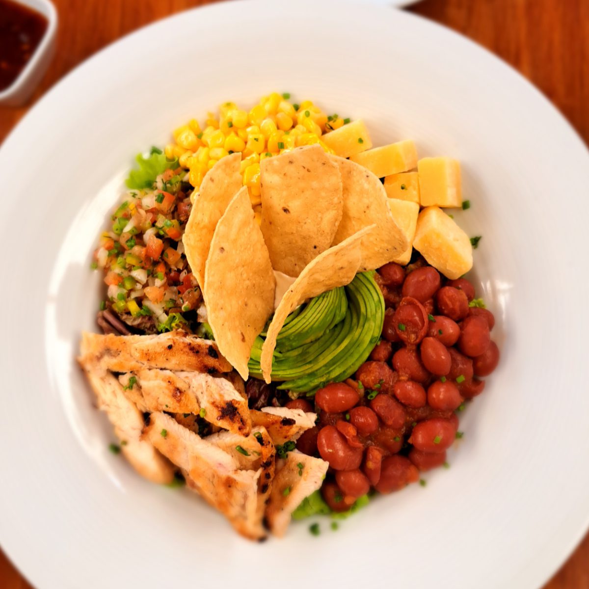 Mezcla de lechuga morada y verde, maíz tierno, queso en cubo, sour cream, totopos, frijol rojo, aguacate y pico de gallo.