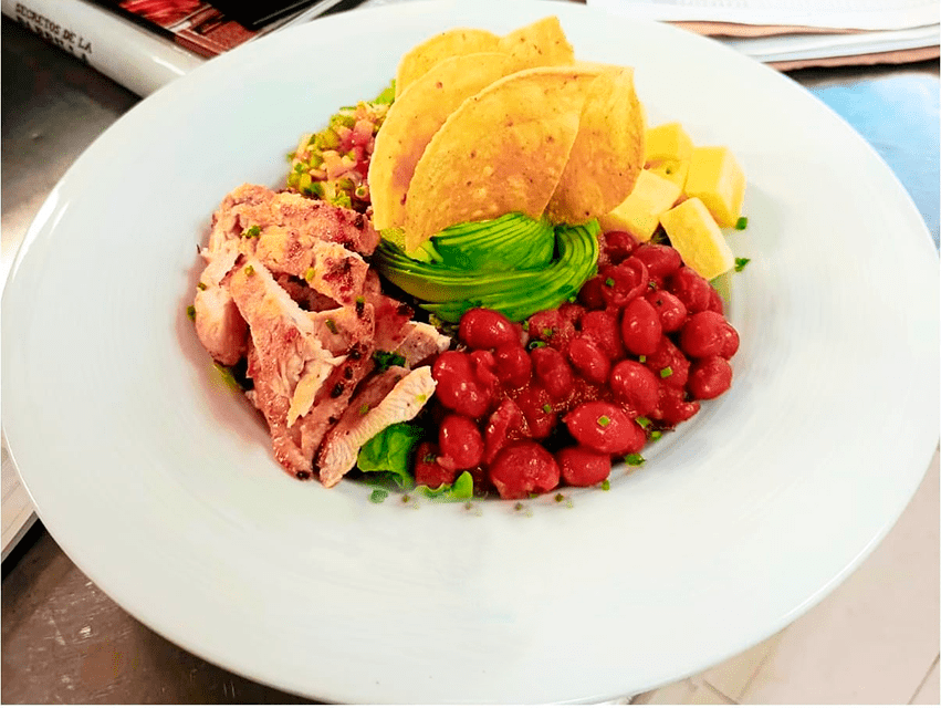 Pechuga, mix de lechugas, maíz tierno, queso en cubo, sour cream, totopos, frijol rojo, aguacate y pico de gallo. Opción vegetariana disponible.