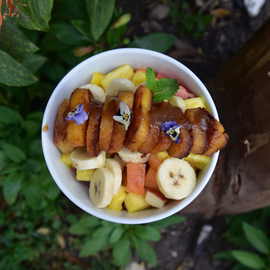 Envuelto de maíz frito en mantequilla endulzado con tamarindo, acompañado con un bowl de fruta fresca picada.