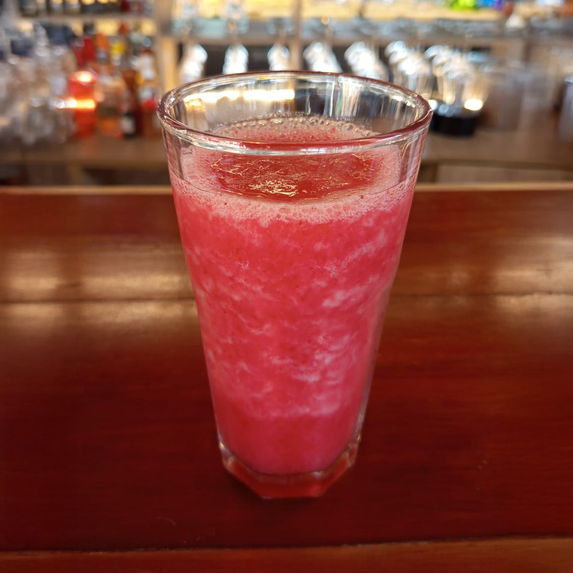 Refrescante jugo natural de fresa, preparado al momento, disponible en agua o leche.