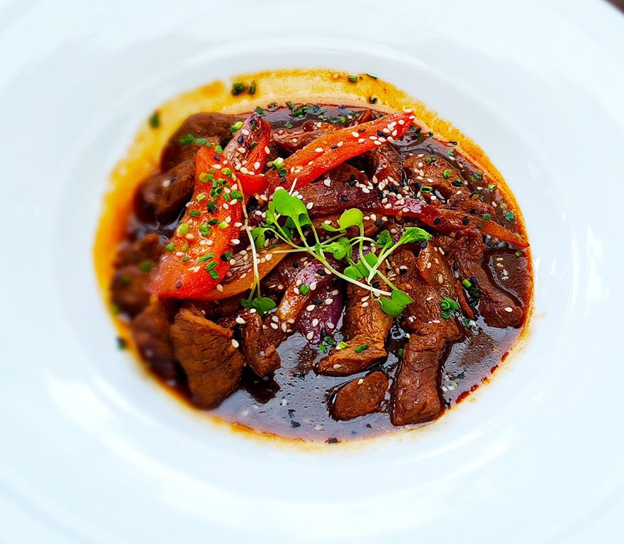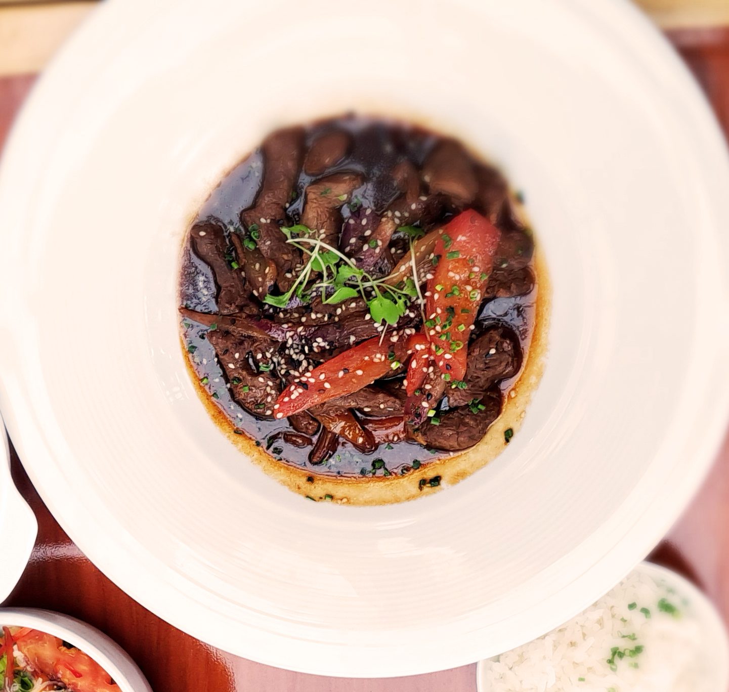 Lomo de res peruano salteado con cebolla, tomate y mango biche en salsa de soya. Acompañado de arroz blanco y papas a la francesa.