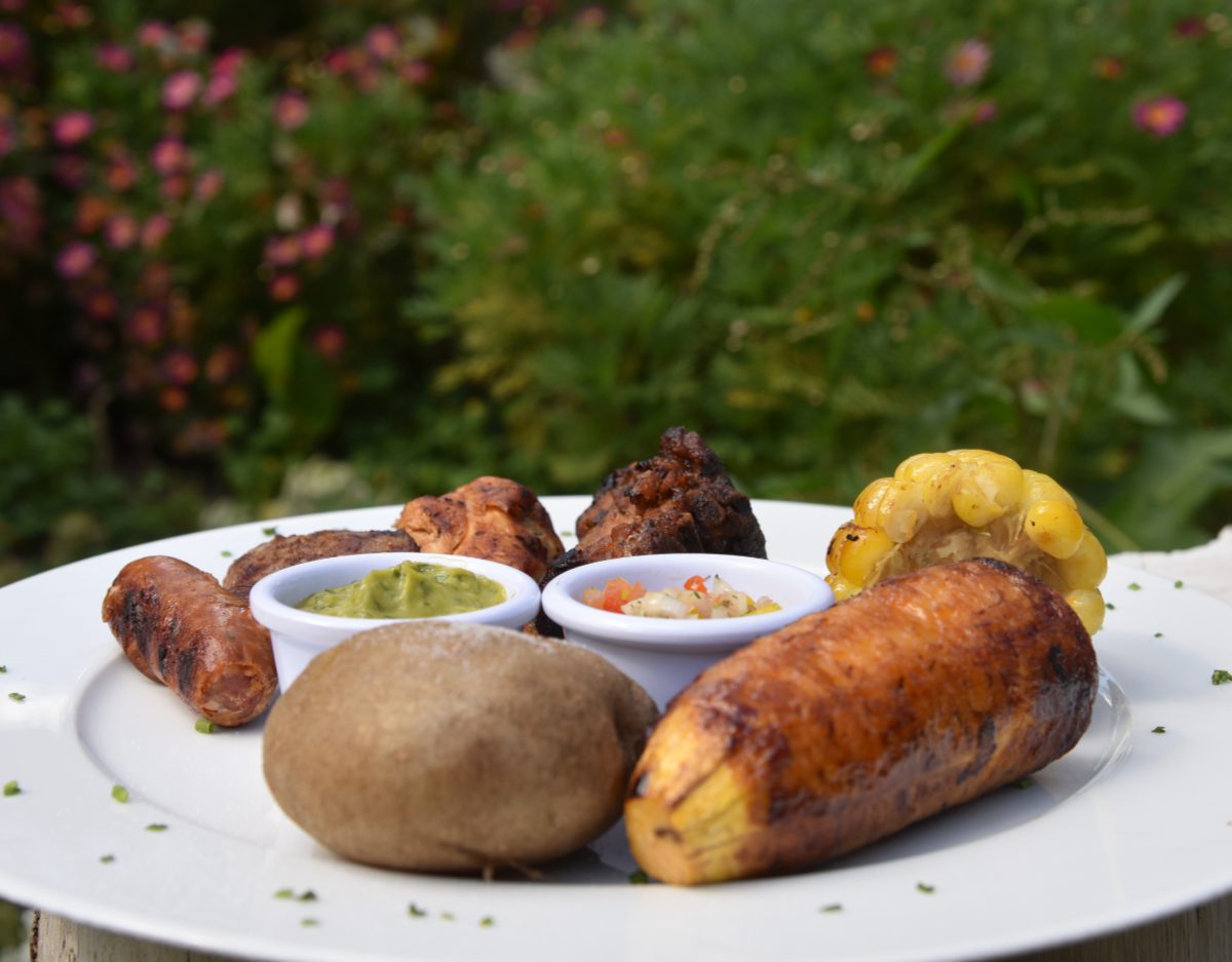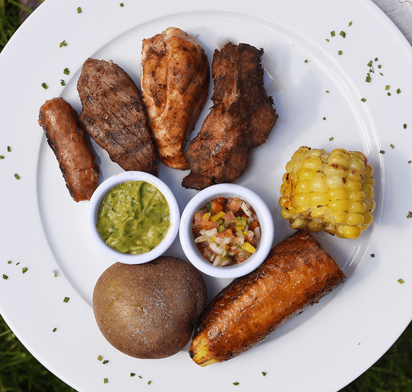 Plato con lomo de res, pollo, chorizo y costilla. Acompañado de mazorca, papa salada, plátano maduro, guacamole y pico de gallo.
