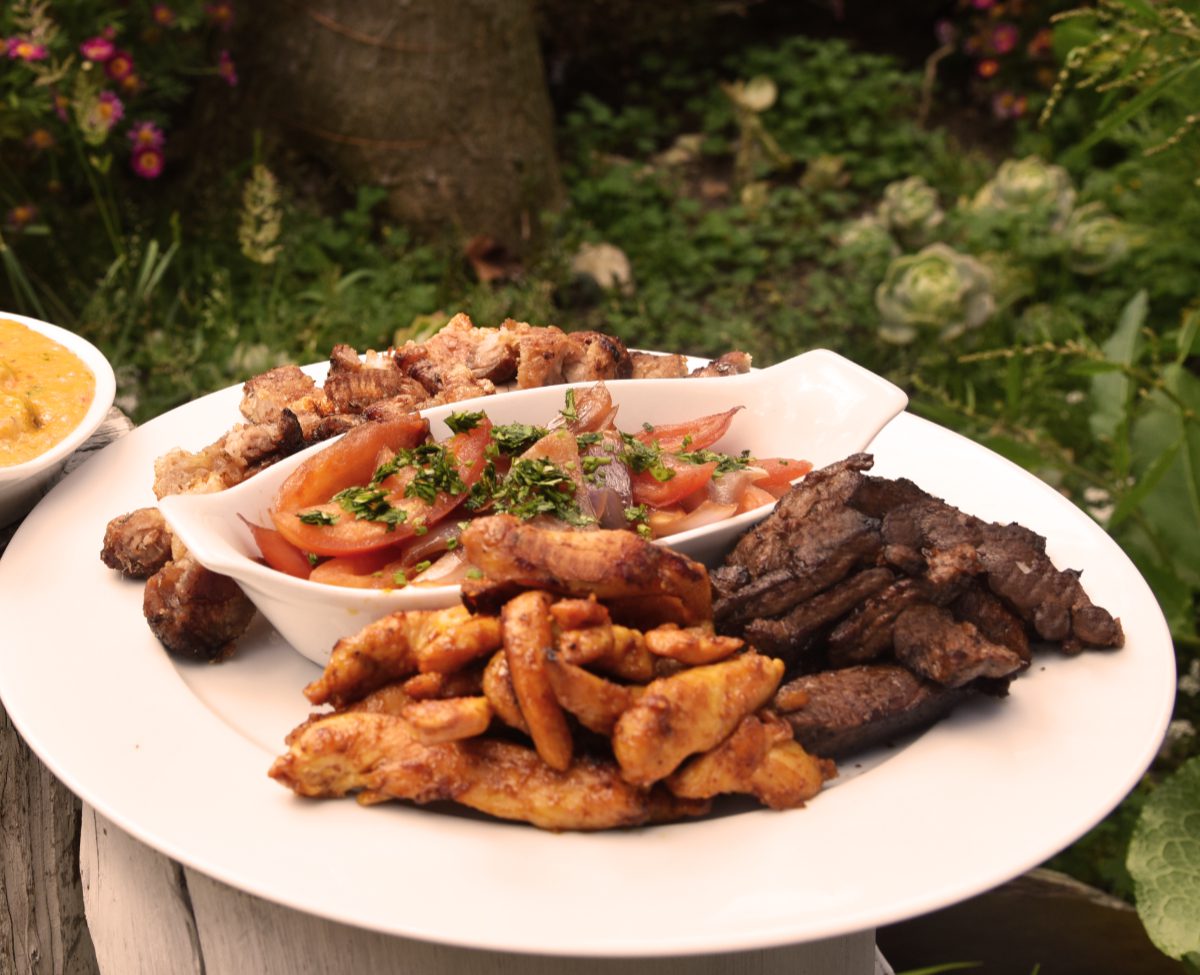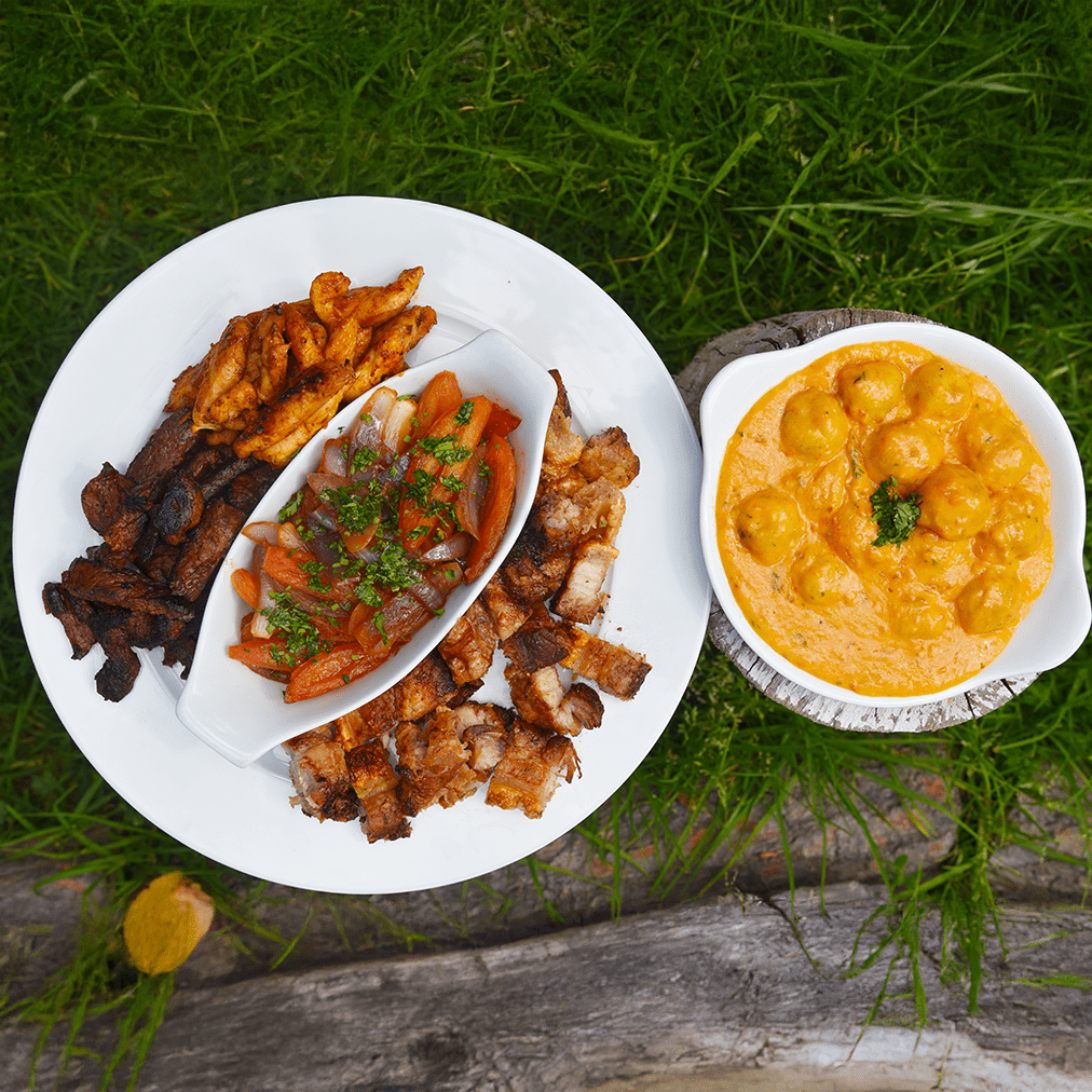 Mix de pechuga en salsa de uchuva, lomo en BBQ de tamarindo, chicharrón con cebolla y tomate grillado, y papa criolla en salsa de queso. Ideal para 3 personas.