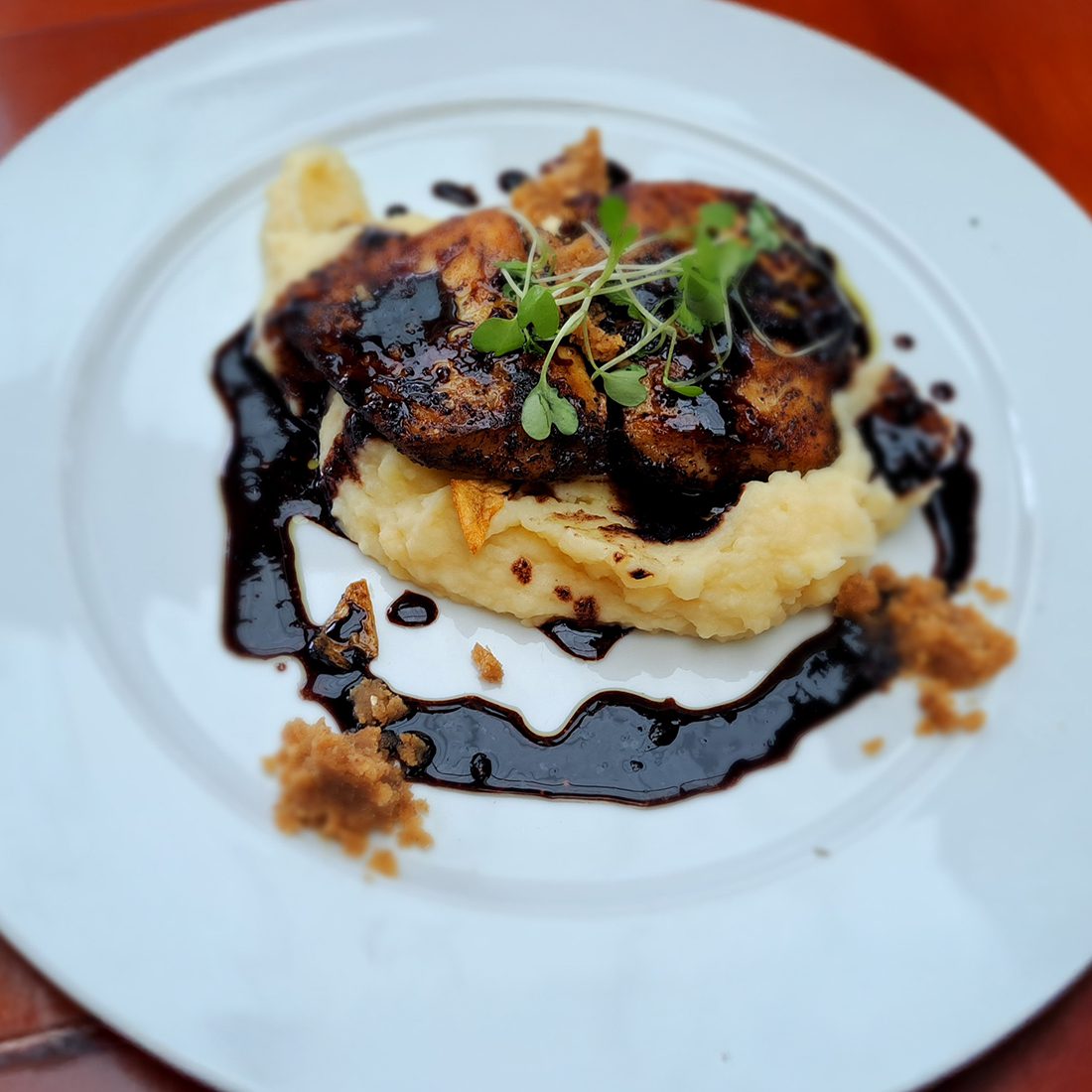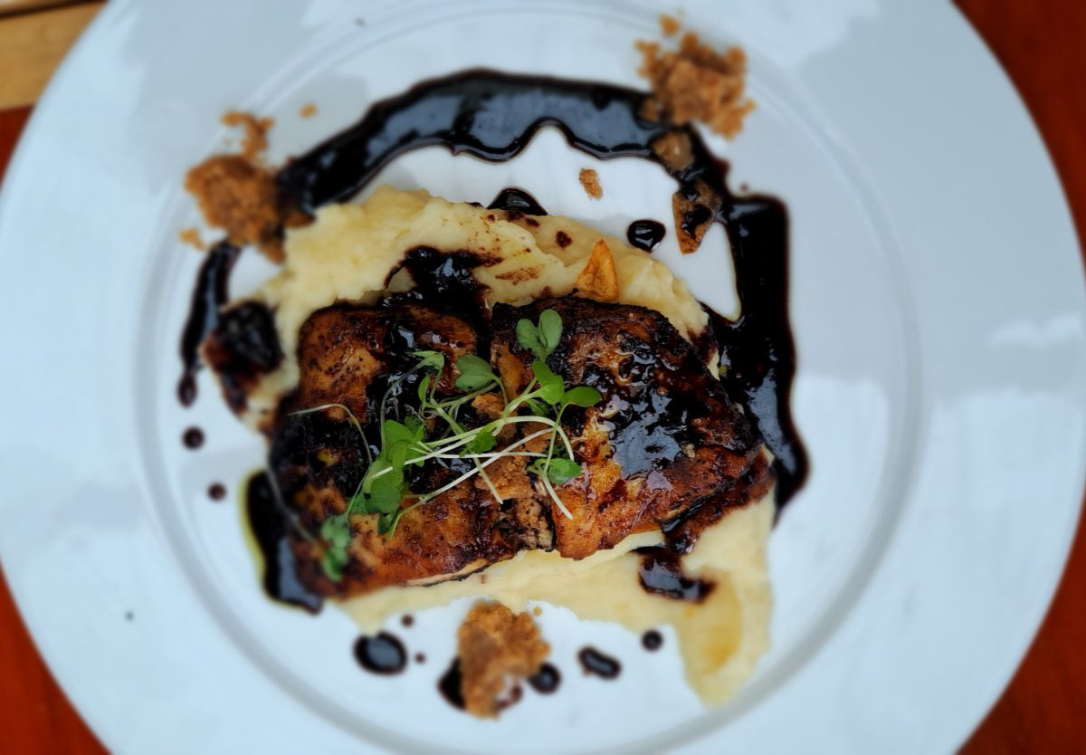 Róbalo a la plancha con salsa de açaí y frutos secos, servido sobre puré de papa y acompañado de ensalada de la casa.